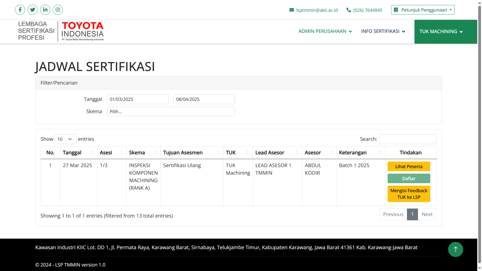 Website berisi fitur-fitur seperti Tentang Program, Skema Sertifikasi, Pendaftaran, Dokumentasi, Testimoni, FAQ, Kontak, Artikel & Informasi, dan fitur-fitur lainnya.